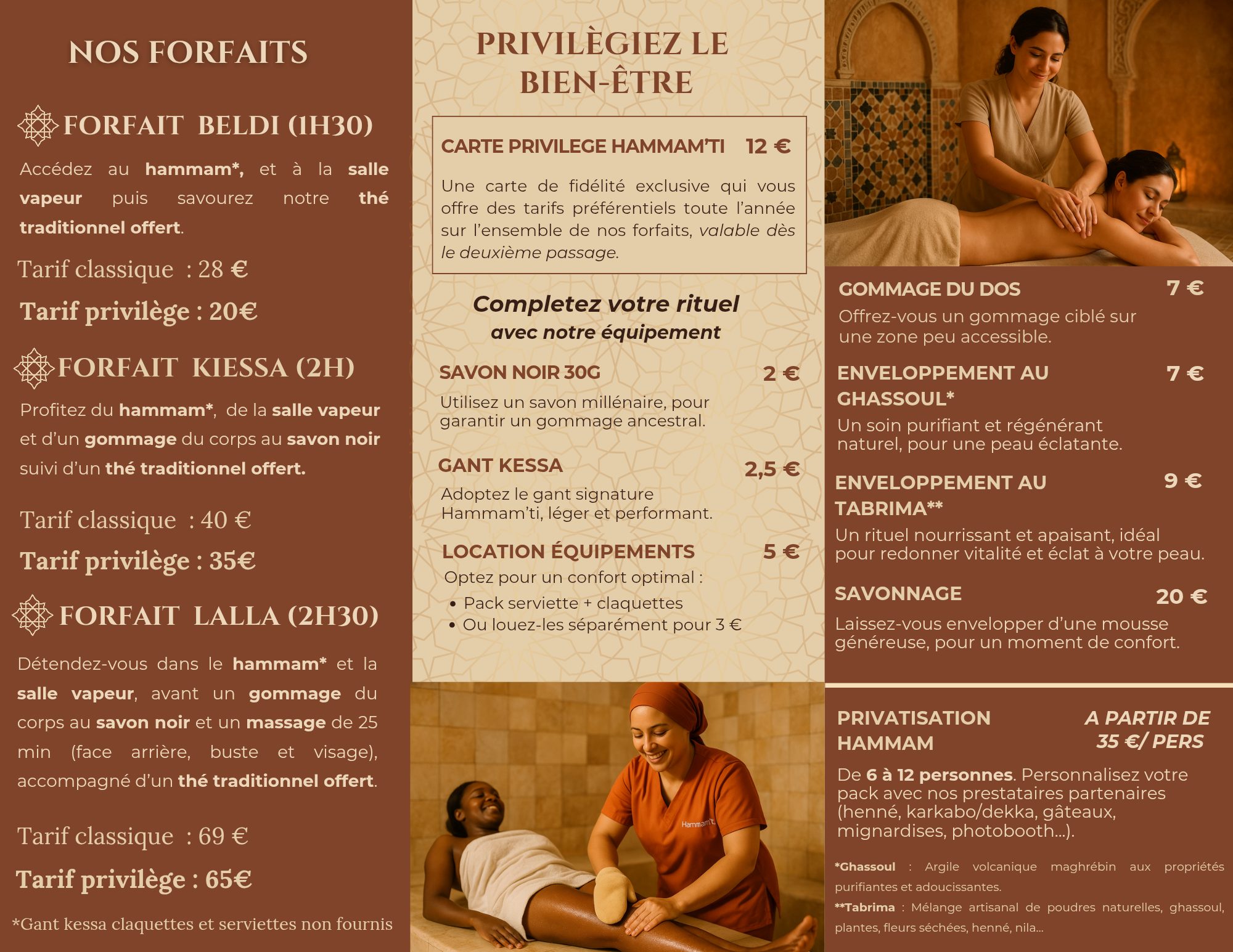 Que vous souhaitiez vous offrir une pause ou surprendre vos proches, Hammam’Ti vous propose :